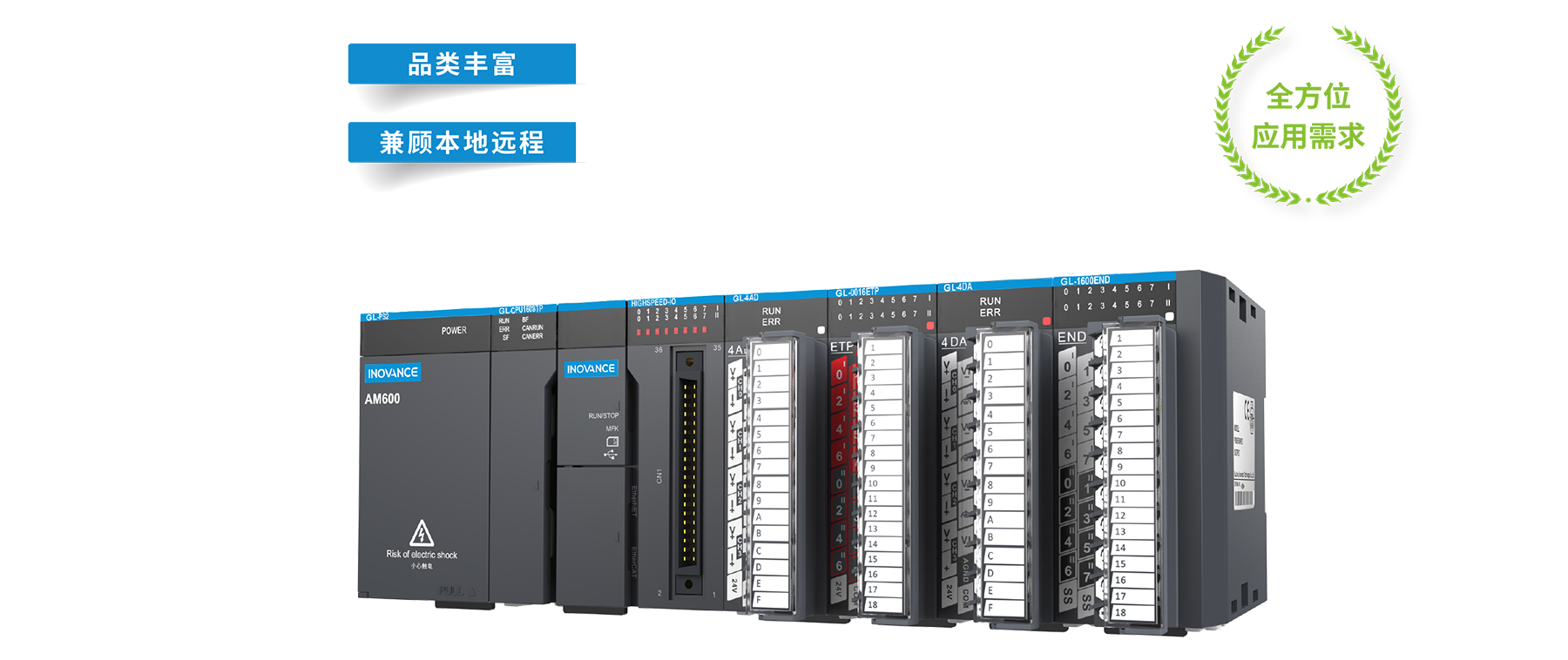 GL10/GR10 系列擴展模塊分為分布式擴展模塊與集中式擴展模塊,涵蓋數字量IO 模塊、模擬量IO 模塊、溫度模塊、CAN/EtherCAT 通信模塊、遠程高速計數模塊、遠程脈沖定位模塊、探針模塊、EtherCAT 從站分支器等豐富的產(chǎn)品類(lèi)型。應用范圍輻射匯川H3U、AM400、AM600 各系列PLC,可滿(mǎn)足用戶(hù)的全方位應用需求。