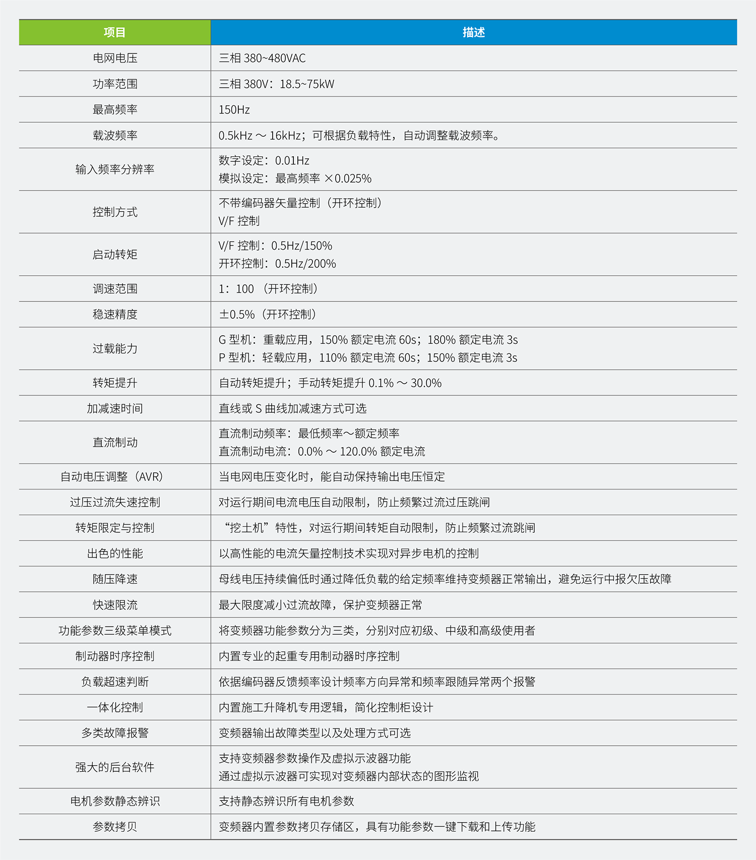 2、施工升降機特有的多電機并聯(lián)使用的情況下,具備專(zhuān)用的開(kāi)環(huán)矢量技術(shù),低頻帶載能力強,安全保護功能好