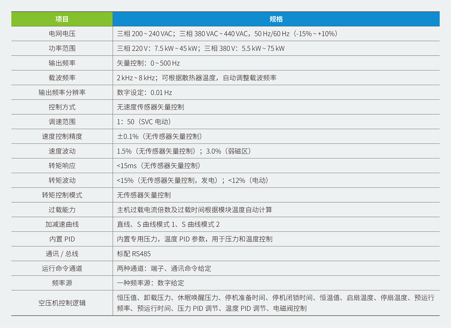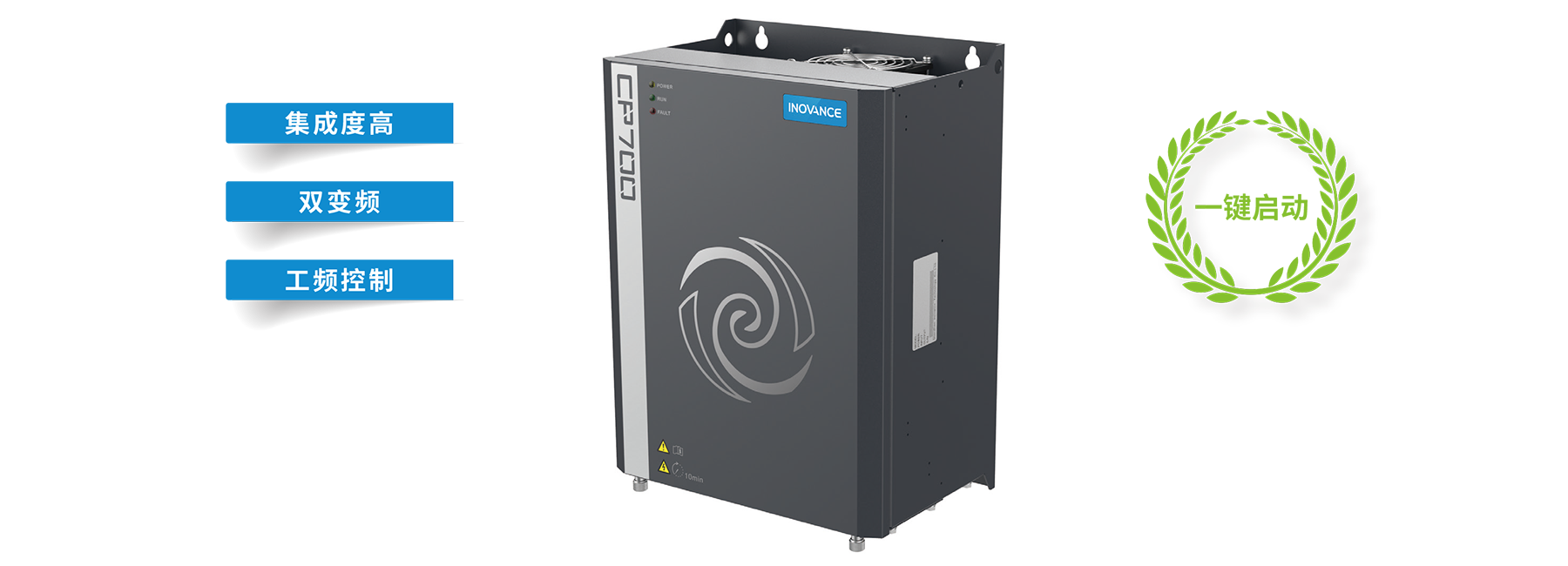 CP700 系列空壓機一體機包含CP700 和CP701 機型,CP700 采用雙變頻和工頻控制,CP701 采用雙變頻控制。產(chǎn)品采用鈑金結構,支持壁掛式安裝方式,安裝簡(jiǎn)便。產(chǎn)品接線(xiàn)調試簡(jiǎn)單易操作,其中控制回路端子采用插拔式接插端子,并進(jìn)行了防錯插設計。產(chǎn)品集成度高,內置220 VAC 交流電源、提供24 V 對外輸出,工頻接觸器;另內置集成PT100 等PTC 檢測電路和保護電路。產(chǎn)品軟件采用專(zhuān)機軟件,與HMI、物聯(lián)網(wǎng)等設備通信無(wú)須調試,實(shí)現一鍵啟動(dòng)。