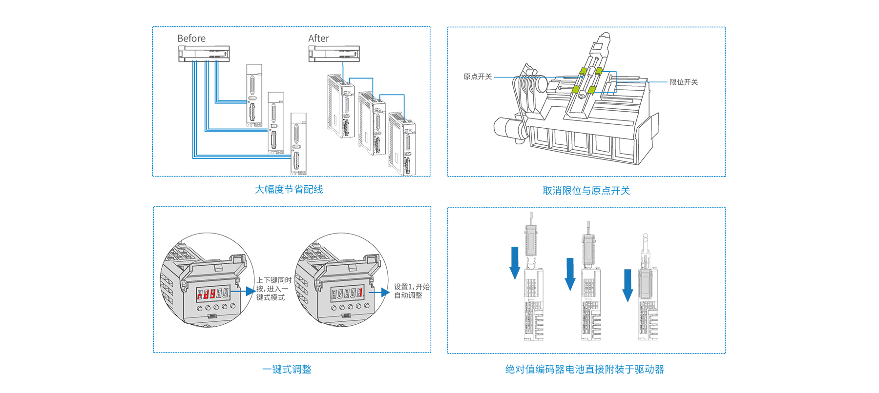 配線(xiàn)方便簡(jiǎn)單;省去限位與原點(diǎn);一鍵式調整;絕對值編碼器電池更換方便可靠