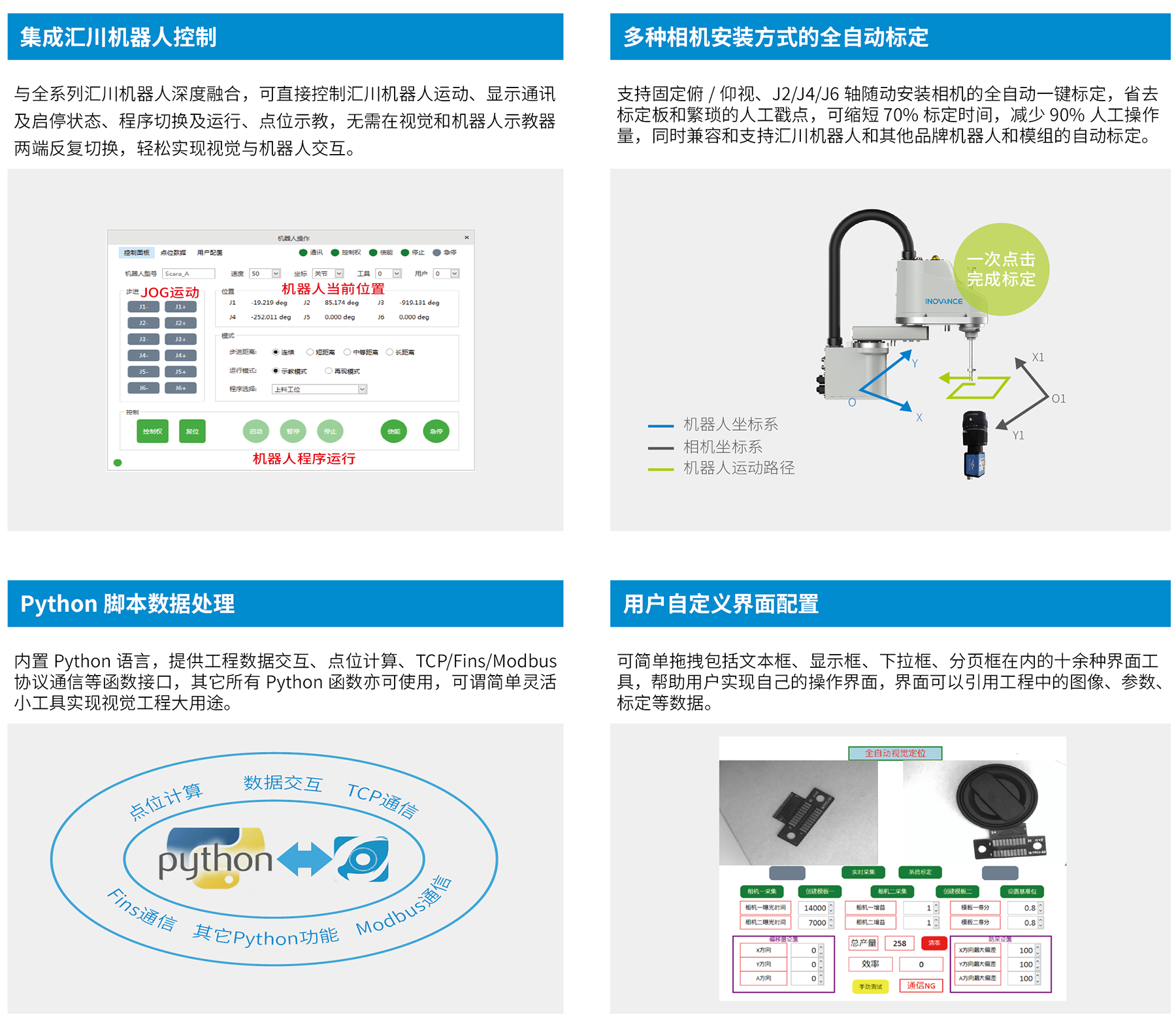 匯川機器人視覺(jué)系統立足工業(yè)應用現場(chǎng),專(zhuān)注于定位引導和簡(jiǎn)單檢測、識別類(lèi)應用場(chǎng)景,與匯川工業(yè)機器人緊密配合,為行業(yè)內客戶(hù)的先進(jìn)工藝技術(shù)提供一體化解決方案。